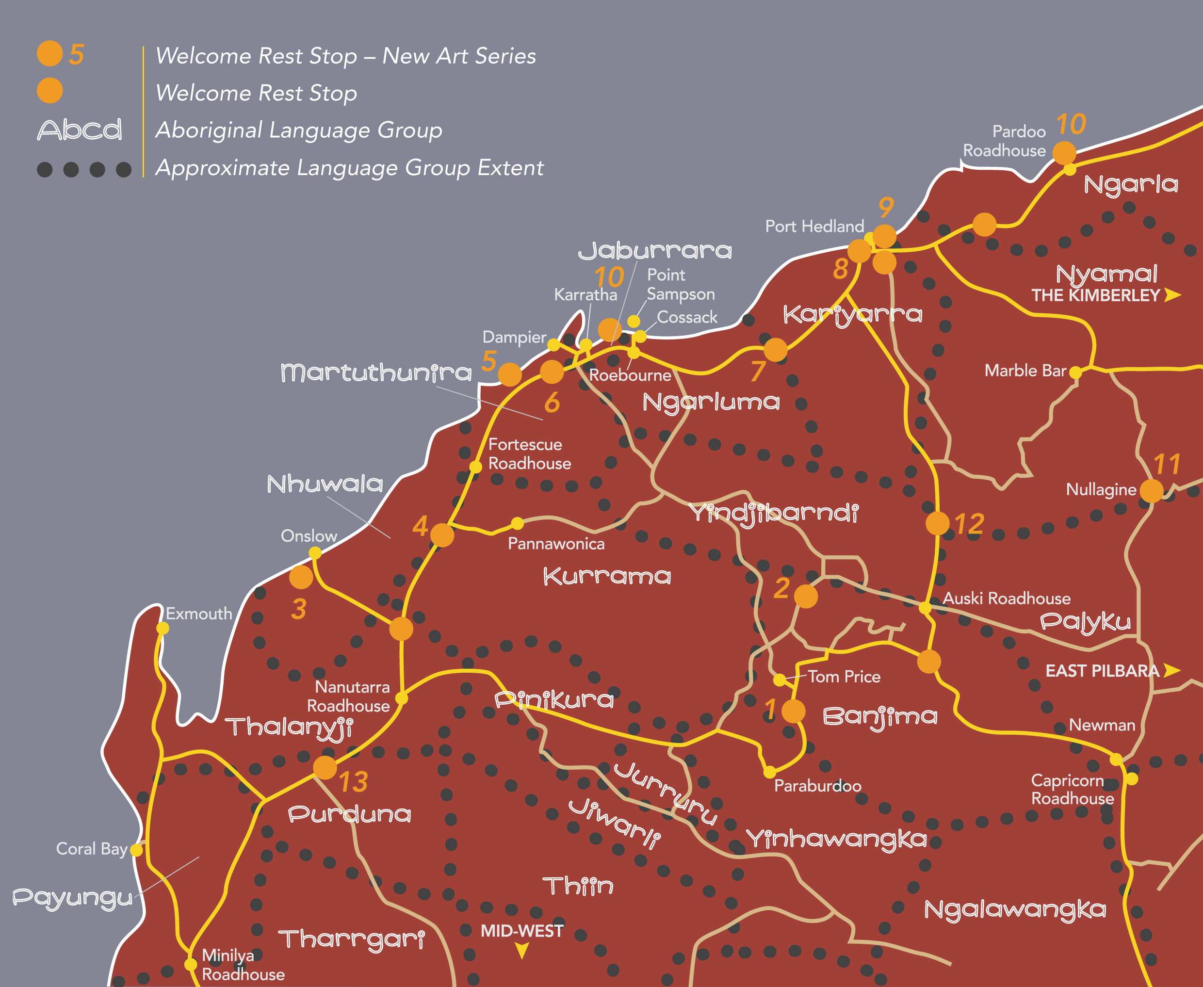 With support from the Department of Regional Development and Lands via the Country Local Government Fund, the Pilbara Regional Council has installed a series of functional and visually-appealing roadside rest stops across the Pilbara. These rest stops aim to enhance the amenity for tourists and residents, offering shelter, ablution facilities, and information on the surrounding region. Selected rest stops will also be equipped with WiFi access points. Each Welcome Rest Stop has its own distinctive artwork laser-cut into its steel canopy. The designs were developed in creative workshops with local Indigenous artists, each interpreting the concepts of shelter and meeting place. More information on these new stops, including their locations / GPS coordinates can be found on the Pilbara Regional Council’s dedicated Welcome Rest Stops website.